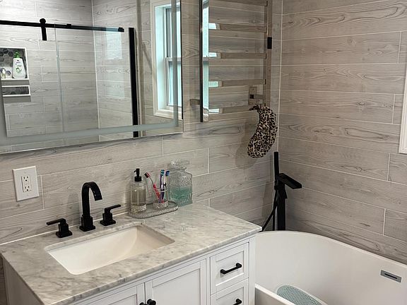 Home has been rebuilt from basement up in 2017*Huge Eat in kitchen with Quartz countertops/breakfast bar with seperate dining area*Laundry room on 1st level off kithen*Sliders to Huge trex deck to a concrete patio/above ground pool and firepit area*Beautiful laminate wood floors thruout*staircase to sitting area/office*4 big bedrooms*MBR boasts ensuite/seperate tub/stall shower/lighted mirror medicine cabinet*gorgeous quartz top vanities 2 walkin closets*walk up Attic*Full finished basement for great entertaining*Living room has Gas fireplace with beautiful white brick surrounding*Attached garage with a concrete driveway to fit 4 cars.