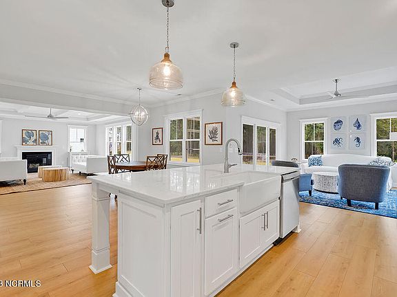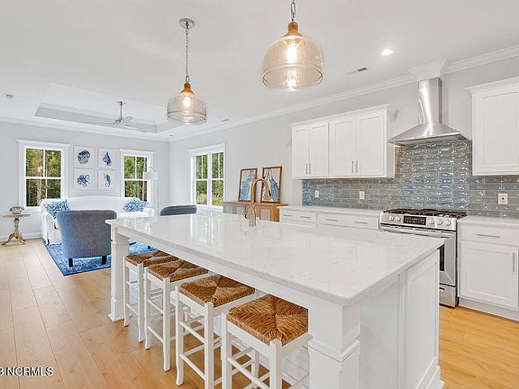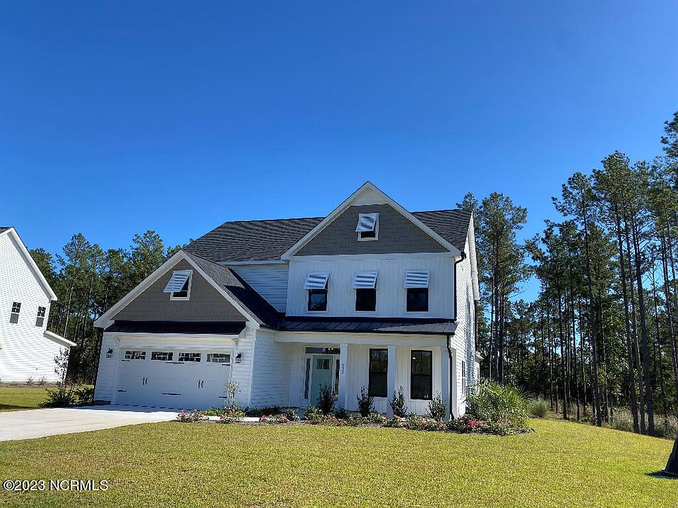 Welcome to the Hall Crest plan by Hardison Building on 1.39 acres! This is a charming, open floorplan with 4 bedrooms and 3.5 baths. The first floor has tons of natural light with a large living room that has a gas fireplace surrounded by a shiplap accent wall. The chefs kitchen with stainless steel appliances, a large island, farm sink and quartz countertops opens to a breakfast area and sitting room with shiplap accent walls and a glass slider that opens to the oversized screened porch overlooking the beautiful private, wooded lot! All downstairs has laminate flooring and ceramic tile in the powder bath. There is a built in drop zone as you enter from the garage with epoxied floor. The upstairs has an oversized primary suite with laminate flooring and stunning views, which leads to the spa like bathroom with a large ceramic tile shower with a frameless glass shower door, 2 vanities with quartz countertops, and a huge his and hers closet. There is also a flex space off of the the closet that can be used as as office! There are 3 more bedrooms and 2 full baths with the laundry room upstairs. This s a private lot with beautiful trees and natural area. Saratoga is in the Topsail School district. Photos or video may be of a similar model. This home is move in ready.
