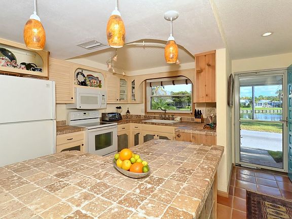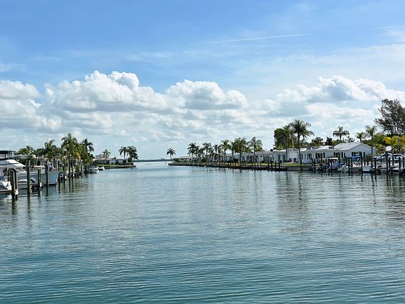 This fully renovated one level, free standing home artfully uses open spaces, natural finishings, sunny windows, and beautiful landscaping to bring the outside in while feeling warm and serene. The L-shaped center island creates an eat-in kitchen which overlooks the bay fed lake teeming with wildlife. The two split bedrooms have inlaid carpet and useful custom closets. The master has a private bathroom and both bathrooms have custom built-ins. Laundry room has washer/dryer and storage. Master bedroom combines with an inviting den/office space with built-in book cases, desk and closet for storage. This room looks out to a lush, tropically landscaped private like patio and garden perfect for relaxing and entertaining. This home is across the street from a private deeded beach access and a short walk or bike ride to shops and restaurants. It is only a short drive to St. Armand's Circle and all the amenities of downtown Sarasota, as well as Anna Maria Island. Dock a boat up to 45' long in a private deep and wide marina. Enjoy kayaking, on site fishing, birding, shelling, the heated pool and a active clubhouse. Can be purchased if under 55 and is pet friendly. This exceptional home must be seen to be truly appreciated.