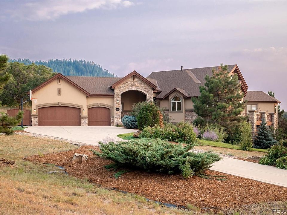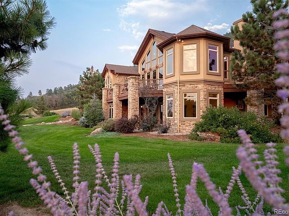 Escape to your own private getaway with this magnificent custom estate in prestigious Bell Mountain Ranch. Surrounded by Colorado's natural beauty, the home offers a peaceful, secluded 7-acre setting that borders a 600-acre open space reserve. Making the most of the spectacular setting, the residence was designed with expansive windows and fabulous outdoor living spaces perfect for enjoying breathtaking views of the mountains and wide-open vistas. Exceptional quality resonates throughout this one-of-a-kind ranch style estate, which boasts a light-filled open-concept layout with over 5000 finished square feet of living space. A warm and luxurious interior has been created with beautiful custom finishes and the perfect use of natural stone and wood. Upgraded features include solid hickory wood flooring, vaulted wood beamed ceilings, Alder cabinetry and trim, slab granite countertops, travertine tile and hand troweled walls.