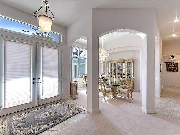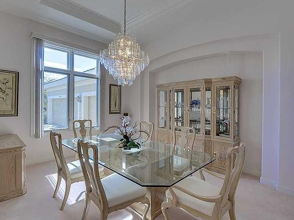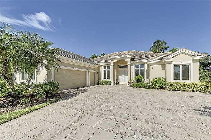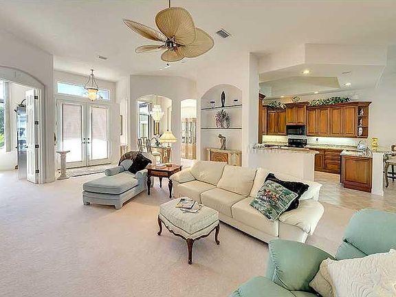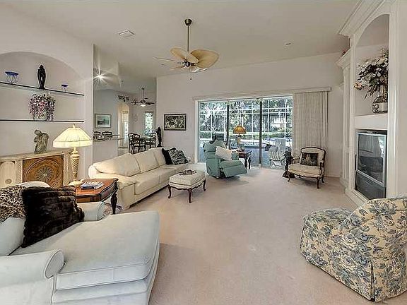 What an great golf view of the 7th tee and fairway! Leading to the home is an attractive stamped concrete driveway, with lots of back-up room, and a side-load garage. Enter this spacious great room home, with high volume ceilings,thru the glass French doors, with the etched transome above. There are 3 bedrooms, with each having its own private bath, all with showers. How nice! There's a den, too, with lovely French doors for privacy. The great room has disappearing sliders leading to the expanded lanai, with its gas and electric heated pool & spa. There is a natural gas fire pit to enjoy on chilly nights and a wonderful summer kitchen cabana, with bar seating all around. The gorgeous kitchen features beautiful granite counters, stainless under-mount sinks, 42"cabinetry, in a warm pecan finish, with crown and under-lighting, a cabinet front on refrigerator, pull-out drawers, a lazy Susan & a large cafe area with a bay window. (A natural gas bib is behind the stove) The master bedroom suite has a pretty bay window, for a sitting area, two closets, with one being a walk-in, a pocket door to the bath, a Roman shower, with a seat & tile trim, a garden tub, two sink areas, a make-up vanity, attractive wood cabinetry and a lockable jewelery cabinet. The laundry room has a sink, cabinets and a closet, for storage, and high efficiency washer and dryer. The big 2 car plus golf cart garage has a work shop, a side door and windows, for lots of natural light. Radiant barrier & Pella windows, too!
