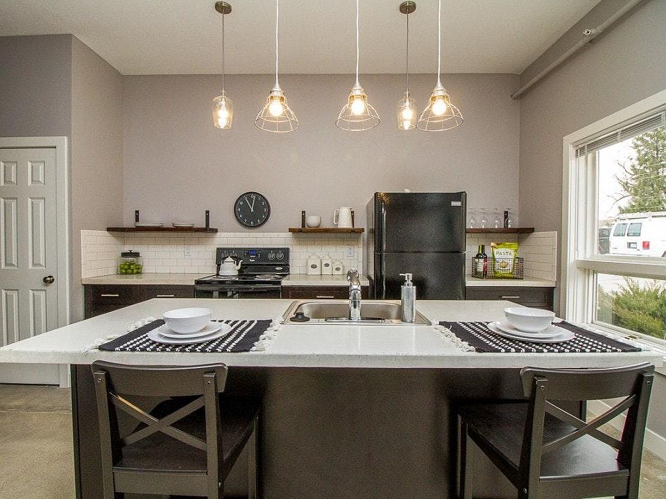 www.urbanstudio43.com Urban Studio 43 is modern living conveniently located in South Kansas City. It is a 43 Unit Garden apartment development with a mix of studios and 1-bedroom apartments. A clean, modern pallet greets you with updated lighting, espresso black kitchen cabinets, essential gray walls with clean, white trim, along with the urban feel of polished concrete countertops and floors. Get swept away by 10 foot ceilings and an airy, open floor plan. 1-12 month leases available. Rent price is for a 12 month lease
