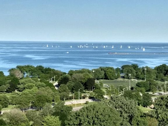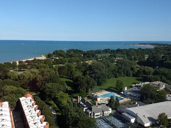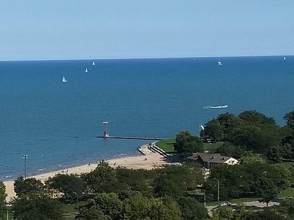 OH THAT VIEW! Imagine.. waking up every morning to the sunrise peeking up from the water. Or in the evening, watching the moon pop over the water creating a peaceful glow. Watch the sailboat races this summer, the fireworks, and air/water show with these direct unobstructed views in this FULL amenity building. Beautiful almost Penthouse 800sf 1 bedroom condo LOADED with closets (5). Lovely open chef's kitchen with white cabinets, with opaque glass doors, and NEW stainless steel appliances. Gorgeous white quartz countertop and breakfast bar, ideal to set up a few bar stools for a casual breakfast or snack. There is a dining area, so plenty of room for your table. Generously sized bedroom with 3 closets and wall to wall windows to gaze on the sky & water. Black out rolling shades included for dark room sleeping. Brand new heater/ac unit in the bedroom. This unit includes a DEEDED Garage Parking space too! FULL amenity building, with 24-hr doorman, INDOOR heated pool, tennis courts, park-like area outside the pool with grills for owners use, sundeck, full gym, business center and friendly, clean laundry. Cable is included in the assessment, including HBO and Showtime! Pets are allowed (2 up to 40lbs) and no rental restrictions. Terrific transportation options too, with the express bus outside the door, and the Redline is just around the corner! This is a perfect in-town residence or for retirement, or your first time purchase. An ideal location with Mariano's at the corner! Don't miss it!