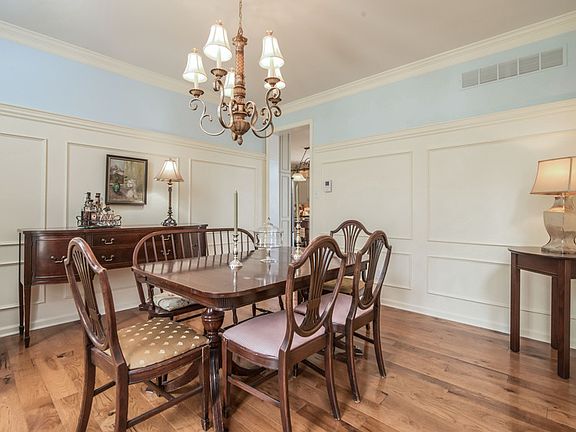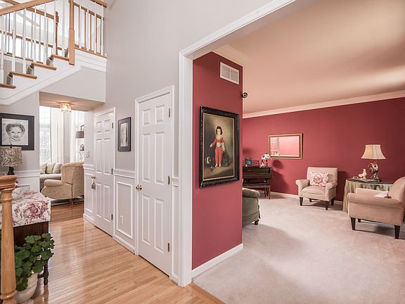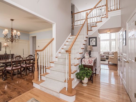 Gorgeous Windtree Colonial with elegant French design accents throughout. Prepare to be impressed with the fabulous gourmet kitchen that features a custom made French LaCanche dual fuel, double oven cast iron range, prized by Chefs everywhere. Stunning cabinetry, custom made center island, granite counters and backsplash and gorgeous hickory wood floors that run throughout the kitchen, laundry/mud room, family room and dining room. The adjacent 2 story family room has dramatic floor to ceiling windows and features a wood burning fireplace with an ornately carved mantle and built-in cabinetry. A private office is just off the family room with French doors leading into the gracious formal living room. Entertaining is easy with the nice flow of this floor plan. The formal dining room has picture ledge height wainscoting and a French color pallet. A side entry 2 car garage with newer carriage doors enters into the laundry room with sink and cabinets and leads into the kitchen. The main staircase from the gracious two story foyer leads up to the 2nd floor and is joined by a back staircase from the kitchen area. The upstairs hallway overlooks the family room with great views of the back yard and the vast open space and protected wooded areas. The large master suite has a bright and sunny sitting room, a large walk-in closet, and master bath with soaker tub and separate shower. Three additional nice size bedrooms are served by the updated hall bath. And you won't want to miss the fantastic lower level - a nicely finished versatile space with ceramic tile flooring that has an inviting TV room, Billiards area, with plenty of space for workout equipment. There's also a full bathroom, a kitchen/bar area and eating area with a Norwegian Jotul cast iron gas stove to warm things up on a cold winter day. Just off the kitchen area you can walk-out to the side backyard allowing natural sunlight to brighten things up during the daytime. Plus plenty of closets and storage space provided for all those 'extra's' that need to be tucked away. Enjoy the sunny backyard deck and when some shade is needed just roll out the electric awning with the push of a button. Sitting on a prime lot with a fenced in portion for a safe play area or pets to roam and play and plenty of lawn surrounded by natural open space, and bordered by a creek and wooded area. Many of the utilities and systems have been updated or replaced. Don't miss this beautiful 'move-in' ready home!