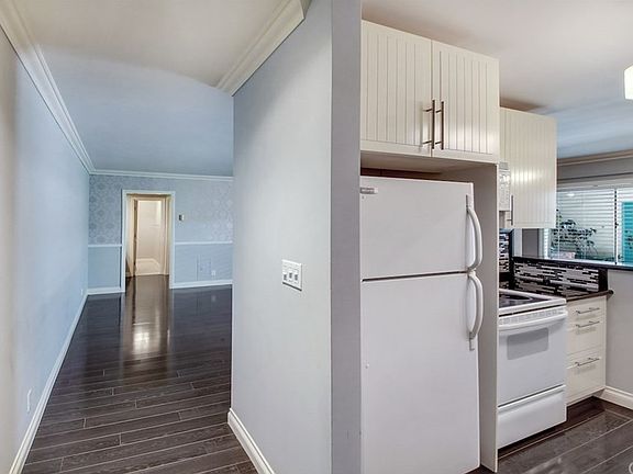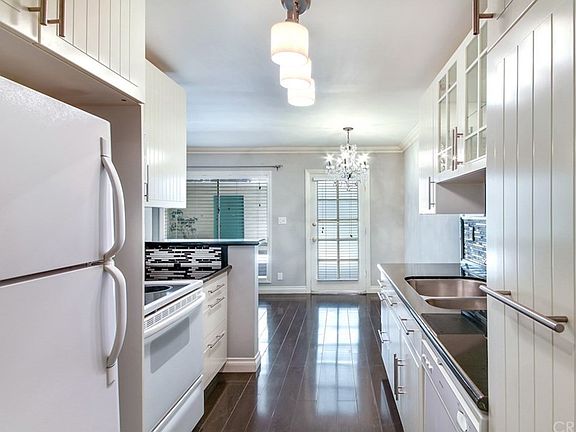 Hard to find completely updated spacious one bedroom Encino unit nestled in the beautiful courtyard setting of Encino Terrace Condominiums. Enter through the formal front door entry, or use the charming French door off the courtyard to find a home with fine attention to detail starting with gleaming espresso laminate floors, crown molding, designer paint and wallpaper, and solid core interior doors with wainscoting panels. The beautiful kitchen has been updated with granite countertops, glass tile backsplash, double sink, wainscoting white cabinetry with self-closing doors and drawers, pantry with pull-out shelving and wine rack next to the dining area with Art Deco crystal chandelier. You will not find a kitchen like this in a one bedroom Encino condo at this price! The living quarters boasts granite countertops and large linen cabinet in the vanity area just outside the bathroom. Ample closet space with two closets in the comfortable bedroom. Great for any first time buyer or someone looking to downsize, this complex is clean, quiet, and secure with a common laundry area, sparkling pool and assigned covered carport space with large additional storage closet. Conveniently located within close proximity to grocery stores, places of worship, excellent schools, freeway and canyon access for your commute. Welcome home to cozy & comfortable Encino living!