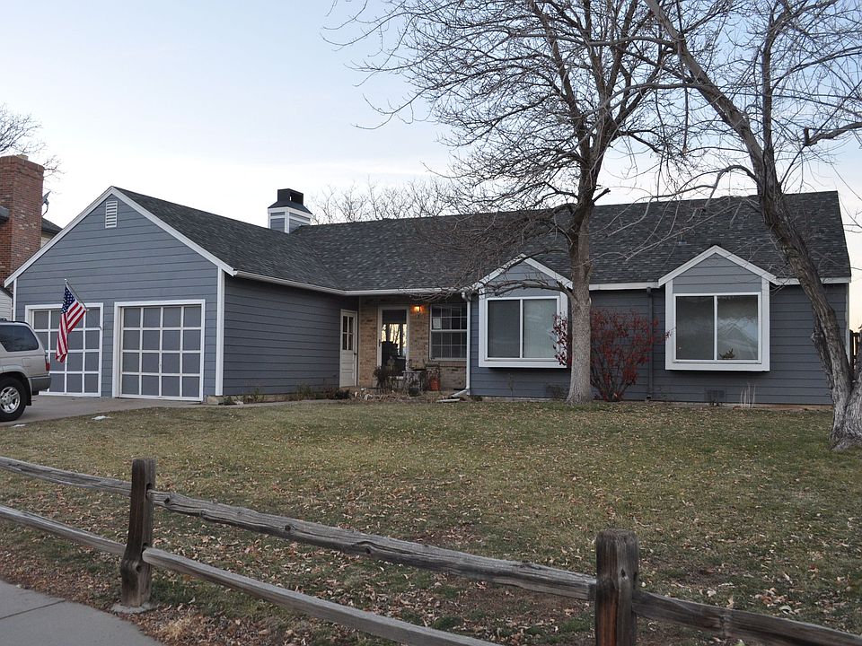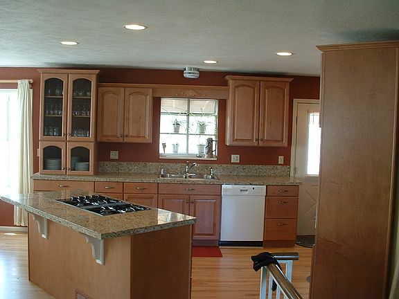 Modern kitchen remodel: granite tile counter tops, cinnamon maple cabinets, wall oven, gas stove-top on island, opened up to dining and living room. Solid hardwood floors. 1408 square foot single family home with 3 bedrooms, 2 bathrooms, and unfinished basement. 5-panel Bow window looks out over the city and the mountains, with a sunset view.