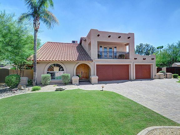 EXTRAORDINARY & EXPANSIVE. Nestled on almost a half-ACRE cul-de-sac lot, this beautifully remodeled home boasts a brand new roof and incredible finishes including vaulted ceilings, Travertine, French doors, hardwood floors, dual-pane windows and surround sound. Generous formal living spaces are warm and welcoming. Redone granite island kitchen has handsome Hickory cabinets and stainless appliances. View terrace off the lavish master. Fourth bedroom has custom Murphy bed. Redone baths. Enormous bonus room with old-world charm features an eat-at wet bar, elevated theater seating and new projector screen. A private oasis, the yard has a Kiva fireplace, BBQ kitchen, two Ramadas, Pebble Sheen pool, spa, waterfall and L-shaped dining patio. Split three-car garage. RV gate. Magic 85254 Zip Code.