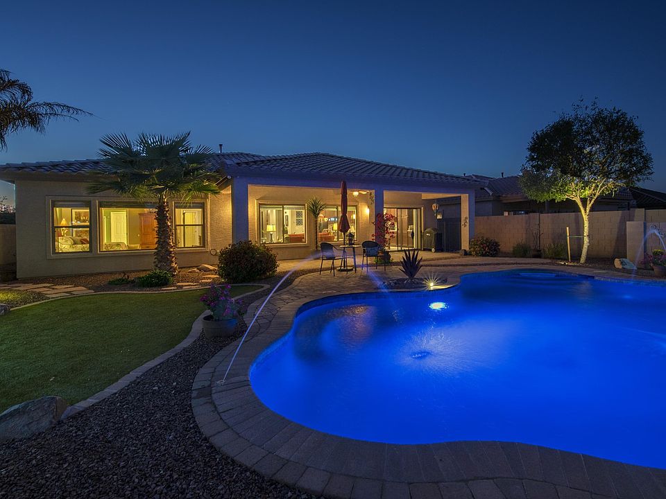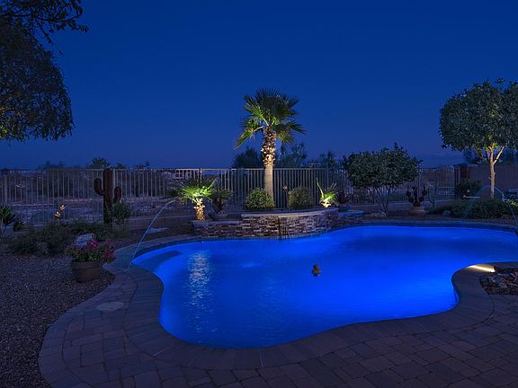 Stunning upgraded designer home & anincredible pool in a private yard that backs up to arroyo includes a view of mountains & city lights. Front elevation features stone accents, a split floorplan with crown moulding, designer wall treatments, custom decor & 9 ft ceilings. The gourmet kitchen has granite counters with glass tile backsplash, a center island, black appliances, custom cabinets & a breakfast nook. A great room concept, surround sound, picture windows & an elegant formal dining room complete the living area. A Spacious master bedroom has picture windows, master bath with a garden tub, large shower & walk in closet. The split plan includes a den-media room, powder room, 2 bedrooms with a Jack & Jill bath. The back yard features a lighted custom pool with a waterfall & view