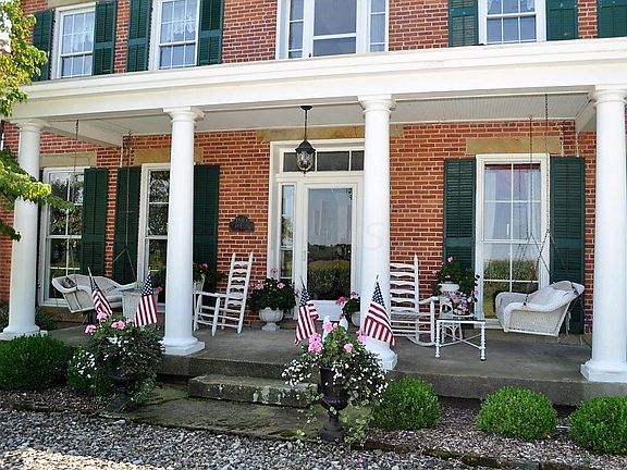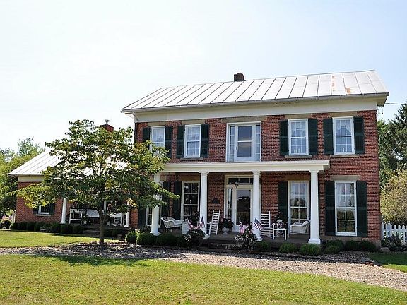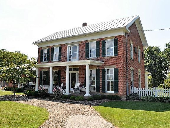 Escape to the country and enjoy the views from this incredible 1840 two-story 3 course brick home situated on 5.26 pristine acres w/a pond. Over 2,500 sq ft w/separate family, living, dining rooms plus a den/office. Country kitchen w/an abundance of cabinets, center island & appliances. Bedroom on main floor can be used as 1st flr owner's suite w/an additional 2 owner's suites upstairs, each w/private full BA & one having walk-in closet & bonus/sitting area. Chestnut floors and walnut woodwork on first floor. Six 8 foot tall windows with original glass in dining room and library.1st flr laundry, 2 car attached AND detached garage + 30x40 outbuilding w/2 large doors & electric. Chicken coop 10x12 with 4 windows, concrete floor and nesting boxes. Just 45 mins to Polaris!