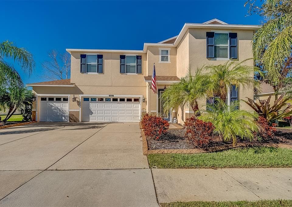 Come and enjoy this beautiful pool home situated on a pond offering spectacular sunsets views! This spacious home boasts a well appointed floor plan with the kitchen open to the dining area and family room as well as a separate living room, office and a half bathroom downstairs. Upstairs you will find the large master suite complete with an en suite bathroom and huge oversized walk-in closet. The large loft with a loft separates the 4 additional bedrooms, two bathrooms and the laundry room. There is tons of storage, a 3-car garage, newer exterior and interior paint and luxury vinyl plank downstairs. The screened in pool has a beautiful waterfall feature & built-in sun shelf making a perfect complement to the stunning backyard with mature tropical landscaping. Harbour Isles offers a community pool, full gym, fishing piers, basketball courts, volleyball courts, playground, jogging trail, R/V & boat storage also available. Conveniently located near shopping, dining, medical facilities with easy access to Tampa, Sarasota, St. Petersburg, Tampa International Airport, sporting events, beaches, theaters & more. Call today!