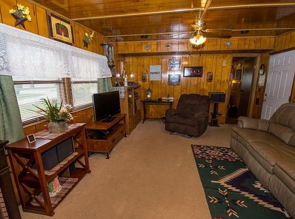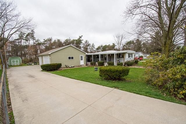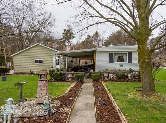 Unique property with a single wide mobile home (14x70) sitting on 2 lots(69x100 & 110x184) fenced, a detached newer built 3 car garage/workshop(24x36), a 12x70 covered patio between the house and garage, nicely landscaped grounds, and the pride of ownership that shows- All wood interior(walls & celings)