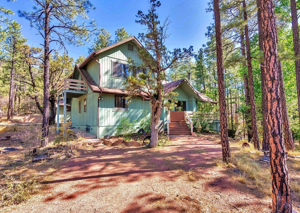 Perfect ''cabin in the woods'' surrounded by majestic pines and the privacy of a big .54 acre lot! Tucked privately on a corner lot, graced with majestic pines this home is the perfect mountain retreat. Imagine sitting on the spacious deck, enjoying cool mountain morning or brisk summer evening while listening to the wind whisper through the pines. The Great Room has a vaulted ceiling, wood detailing and gas fireplace, perfect for a mountain home. The cozy kitchen has all stainless steel appliances, tiled counter tops and white cabinetry. Upstairs is the private Master Retreat with en suite bath featuring dual vanities. On the main level are two guest bedrooms. Accessible from the exterior is a ''Flex Room'' which would be perfect as an exercise room, art room of many other purposes. Oversized 1 car garage is perfect for a workshop or to store your toys. This location is so private and ideal for enjoying the peacefulness and tranquility of nature ... this is the perfect escape!