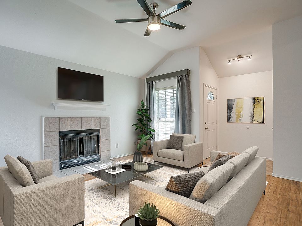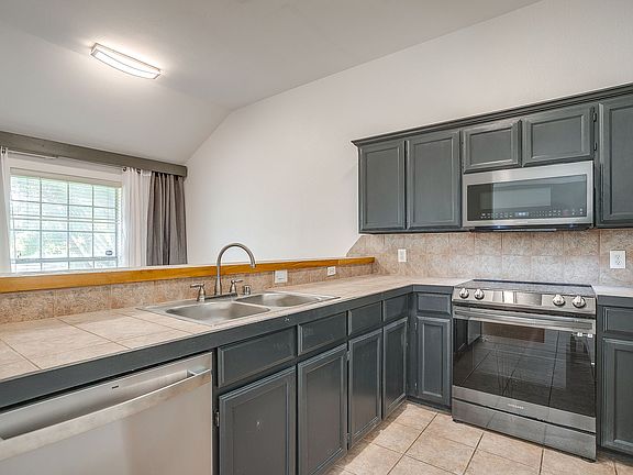 The home feels fresh and clean thanks to low-maintenance tile and wood vinyl plank flooring throughout no carpet anywhere. The kitchen comes equipped with stainless steel appliances, including a dishwasher, refrigerator, and microwave, along with ample cabinet storage. For added convenience, the unit includes in-home washer and dryer hookups.