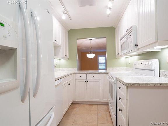 1st floor 2/2 condo overlooking golf course. Light & bright, cheery unit with a wonderful newer upgraded kitchen. Pretty, white cabinets(bead board) and Corion-style countertops. Nice Maytag refrig. with freezer on the bottom & no seam top, for full usage. Water & ice on the door. Frigidaire dishwasher & range. Disposal, too. Track lighting for extra good vision. Washer/dryer in unit. Plantation shutters and accordion storm shutters are definitely a bonus!! Newer vanities in both bathrooms. Miles Grant is close to funky & fun Pt. Salerno with it's wonderful restaurants offering fresh seafood from catches of local fishermen. Art & crafts stores makes for fun shopping. Downtown Stuart is just a few minutes away as well, with music & theatre & restaurants galore. Miles Grant Country Club is 55+ community offering golf,putting green,tennis court,bocce,shuffleboard, kayaking,clubhouse,restaurant,lounge & bar.Social membership is required. $165.08 a mo./min $350 pp per yr. for food & bev.