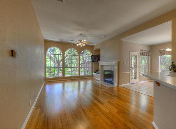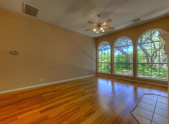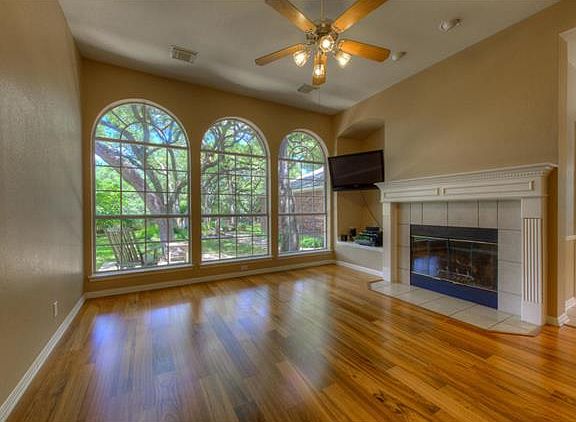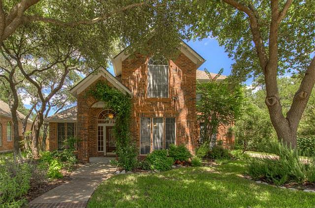 Beautiful property all around. Newmark Travis floorplan hybrid on absolutely stunning, park-like grounds backing to permanent greenbelt. Very private back yard, almost 1/3rd acre full of huge towering shade trees. Outdoor grilling areas, very private and plenty of room for a pool. Master is down with upgraded bath with frameless, travertine and hardware. Wood floors in family room are stunning. Kitchen looks over fm. rm., hi ceils.,nice moldings. "On the Park" Open house 1-3 Sat and Sun. Text John