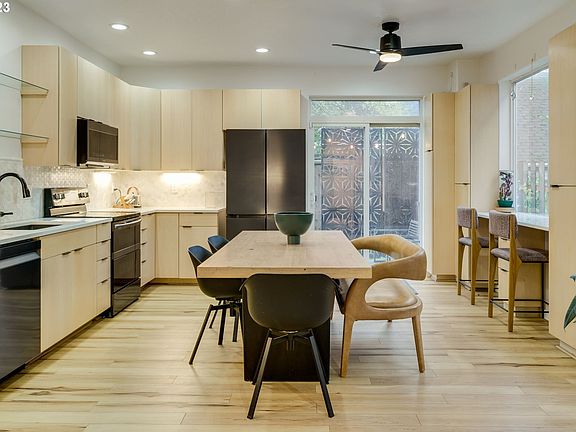 This 2005 construction in Brentwood Darlington packs a punch with incredible main floor Japandi design blending simplicity, natural elements & comfort! Enter in through the long airy hall to the great room w/smartcore hickory LVP flooring throughout. The cozy gas fireplace is surrounded by custom Spanish glazed tilework & provides a warm glow when it's chilly. The full kitchen/main re-do in 2021 provided a complete overhaul of ho-hum boilerplate builder surfaces. Gorgeous alder custom cabinetry, quartz countertops tile backsplash, energy star black stainless-steel appliances & built ins all blend beautifully in the light filled great room. Sliding doors lead to the fenced back yard w/patio, privacy screens + raised beds. With space for a Traeger or BBQ, the twinkle lights provide perfect summer evening dinner ambiance! Head on upstairs w/the on-trend deep charcoal carpeting on stairs, hallways & two upper bedrooms. Two bedrooms provide plenty of room for guests, flex space, office, or for kiddos. Their own hall bathroom has a tub/shower combo, newer vanity w/Carrara marble top, sink, faucet, newer flooring. Opposite the hall bathroom are the side-by-side washer & dryer that stay with the home. Continuing to the back of the upper level is the primary suite w/vaulted ceilings, expansive window, generous closets & attached en-suite bathroom. This bathroom was similarly updated this year w/new vanity, Carrara marble countertop, sink, faucet, + new flooring. Incredible retreat from the world at the end of a long day! Smart features to the max include smart appliances, lighting, security system, thermostat, and Ring doorbell, this home is dialed in! The single car garage is attached and features a fantastic garage storage system that stays with the property. Proximity to Woodstock neighborhood, eateries, and amenities, yet a zip to all points Portland with easy transit options, the location of this home can?t be beat! Fantastic option for buyers & investors alike!