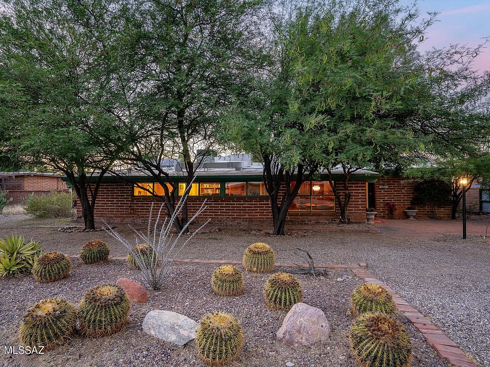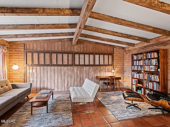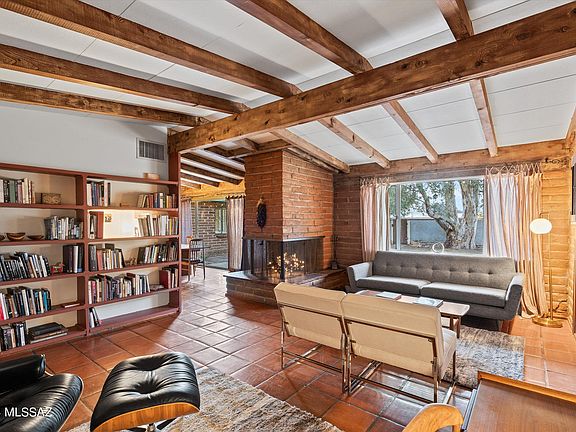 Calling all mid-century connoisseurs!Much desired Highland Vista is where this quintessential Tucson burnt adobe ranch awaits. Sweetly ensconced behind a landscaped semi-circular drive, the enchanting curb appeal evokes nostalgia.Welcomed by saltillo floors, vaulted beamed ceilings, gray washed paneling, and focal fireplace a sense of time unfurls as you transport into this hideaway. Around the corner, walls of glass provide delightful backyard views plus a fabulously framed dining experience! The home's center hub contains a kitchen, breakfast nook, family room, and private guest bedroom all overlooking the front yard. Aesthetic corrugated ceiling, slate and copper trimmed counters, solid wood cabinetry, and lots of storage options are some of the unique kitchen features. A bonus room serves to connect the hub and bedroom wing. Where an updated hall bath beautifully blends modern and mid-century styles with chic results. Adjacent to it is a gorgeously spacious bedroom featuring classic corner windows and lighted walk-in closet.