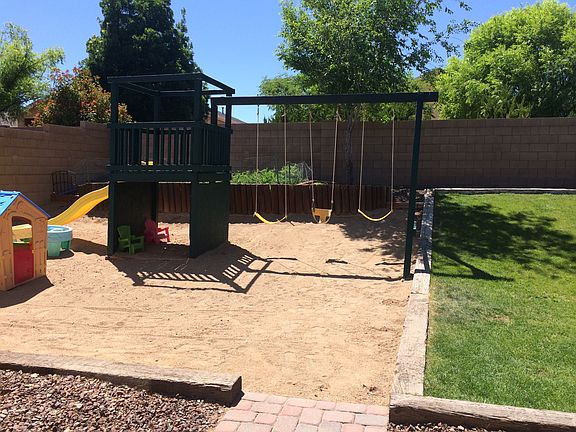 Lovely Granville home offers 2 bedrooms plus Den (easy convert to 3rd bedroom) plus oversized lot with swingset, sand box, RV gate and even covered parking structure "dug into" side yard to accommodate the toys! This popular floor plan boasts a split bedroom concept, raised height ceilings with 8' raised panel doors, tile in kitchen, entry & baths, ceiling fans in each bdrm, den & living room! Master features dual vanity, sep garden tub & walk-in shower & large walk-in closet. Large eat-in kitchen offers abundant cabinetry, recessed lighting, smoothtop range! Park-like backyard features generous patio, private setting, extensive raised garden beds on drip mountain views & plenty of room for entertaining!Home is short walk from community school as well as clubhouse CONTINUED...