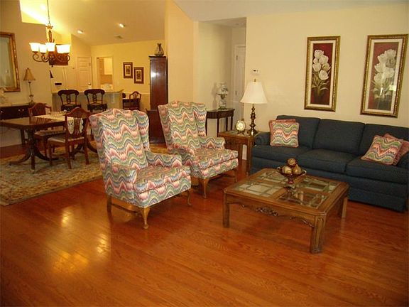 This Home Is spacious and bright. Lots of hardwoods and Living Room has marble fireplace. Living room overlooks dining room and Kitchen. Master bedroom has vaulted ceilings and large walk-in closet, and master bath has double vanities. The second bedroom is also large. Library/office is overlooking private back yard. The sun room also looks ouy to private yard with a view. Stairs carpeted to attic for all your storage needs. Large Garage has storage space. Great neighborhood with pool, club house, Physical fitness facilities, conference room. Pet walk, walk to shopping and dining.