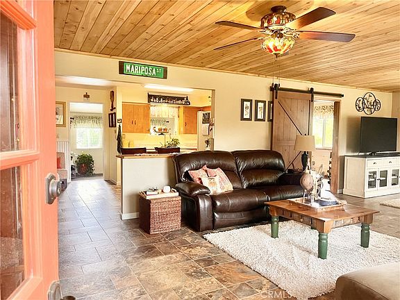 Aesthetically pleasing and pristine haven in impeccable condition! This Mariposa retreat combines small-town serenity with cutting-edge upgrades showcasing a new wood stove insert for cozy warmth and a high-efficency mini-split system for year-round climate control. A bonus room behind a gorgeous sliding barn door offers limitless use whether it's a butler's pantry, office space, craft room, mancave den, wine cellar, or hidden library...you decide! Every window has a wonderful view, bringing the outside in. An automatic gate for enhanced security and exclusivity greets you as you make your way up to the circular driveway. There's a massive detached garage featuring an ample storage room and outdoor workshop connected by a peaceful breezeway. There's an additional carport fully wired with electrical offering a versatile space for hobbyists and car enthusiasts. The expansive lot is a natural lovers paradise showcasing abundant landscaping with meticulously curated gardens, mature trees, distant mountain views, and vibrant lupine fields that bloom with seasonal colors. A seasonal creek provides a serene ambiance with soothing sounds of spring water. This property is ideal for families, vacation home seekers, or investors looking for a high-demand rental in a prime location. Discover an unparalleled blend of modern comfort and proximity to Yosemite National Park iconic landscapes.