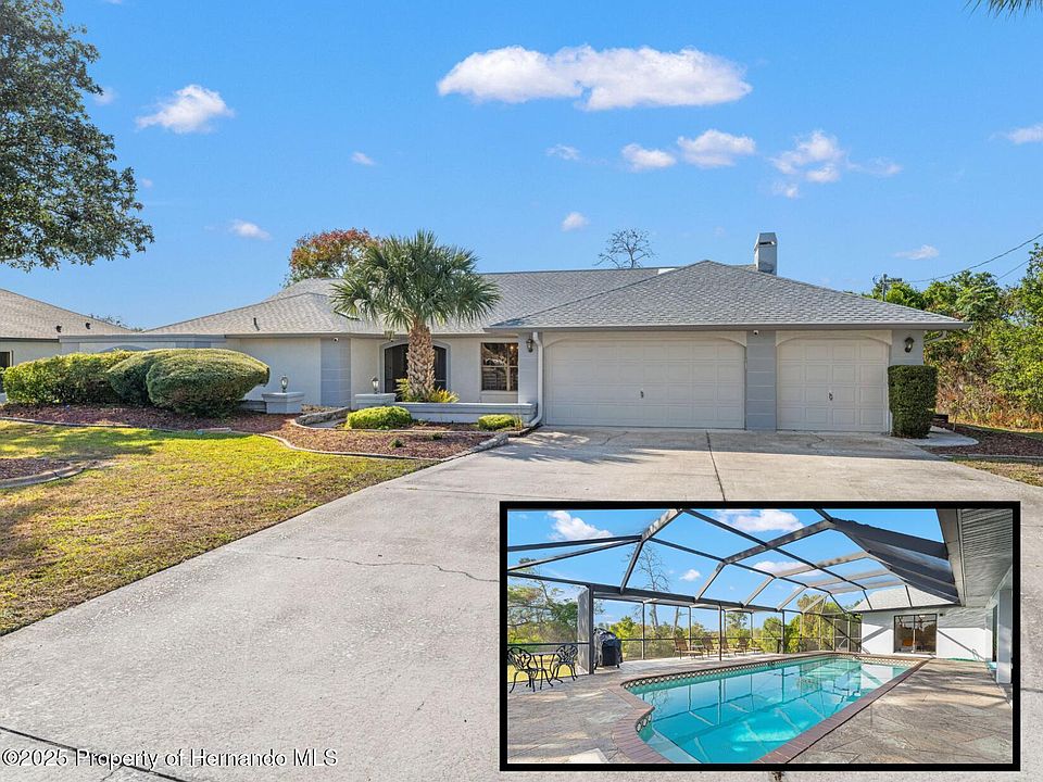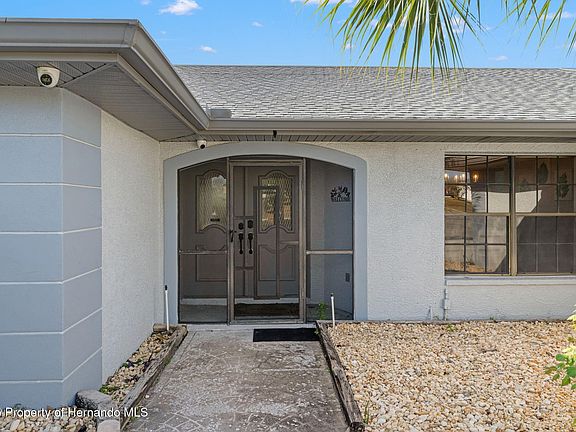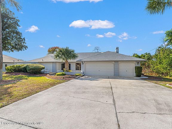 Welcome to this beautifully updated 3-bedroom, 2-bath, 3-car garage home perfectly positioned along the 8th hole of Oak Hill Golf Course. From the moment you step through the double-door entry, you're greeted by cathedral ceilings, exposed wood beams, and views of the sparkling pool. The bright dining area flows seamlessly into the kitchen, featuring warm wood cabinetry with pull out drawers, a cozy breakfast nook, and plenty of natural light overlooking the pool. Just off the kitchen, the den offers a comfortable retreat with cathedral ceilings, a wood beam accent, and a wood-burning fireplace. Tucked away in the rear of the home are two spacious guest bedrooms, offering privacy for family or guests. One bedroom opens directly to the pool area and shares a well-appointed pool bath with double vanities and a walk-in shower. On the opposite side of the home, ideal for privacy, is the cozy owner's retreat— impressing with soaring cathedral ceilings, wood beams, his-and-hers closets, and a luxurious en suite bath featuring double vanities, a soaking tub, and a separate shower. Step outside through pocket sliders for true indoor/outdoor living. Enjoy the covered patio, sun deck, and sweeping golf course views—a perfect setting for entertaining or relaxing by the pool. Additional highlights include: Roof (2025), Water Heater (2023), A/C (2015), Pool Pump (2 years old), Full Home Water Softener System, inside and outside painted 2022, Outdoor Cameras & Keyless Entry and Extra Storage closets in Garage! This home beautifully blends comfort, style, and Florida lifestyle living—all right on the golf course! With NO HOA or CDD and situated in the heart of Hernando close to all amenities, restaurants and activities this home will not last long, call today for your private showing!