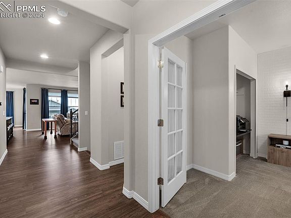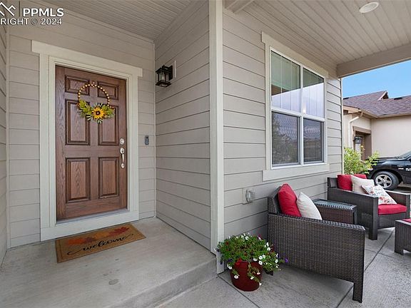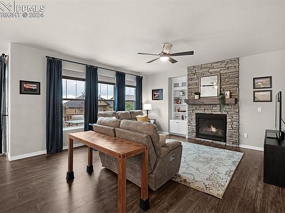 This impeccably maintained masterpiece in Cordera flaunts a wealth of high-end upgrades, offering breathtaking views of Pikes Peak & the Front Range. Located within walking distance to elementary & middle schools, as well as the pool & community center, the main floor’s open & airy layout features a spacious living room, complete with a gas fireplace & charming built-ins, main-floor bedroom & bath, kitchen, living, & dining areas. The custom gourmet kitchen boasts shimmering quartz countertops, a grand center island, & premium KitchenAid stainless steel appliances, including a gas cooktop with a striking range hood. Soft-close cabinets enhance both style & functionality. Walk out to your deck with gorgeous mountain views & a retractable awning for a peaceful retreat. The versatile main-floor bedroom & bathroom provide ideal options for a private home office or guest suite. Ascend to the upper level to discover a luxurious primary suite with mountain views, a lavish five-piece ensuite bathroom w/ a water closet, & an expansive walk-in closet. Two additional generously sized bedrooms share a full bathroom, while the convenient loft offers extra space, & the upper-level laundry room adds to functionality. The finished basement extends your living space with a recreation room—perfect for a home gym or media room. An additional bedroom & bathroom offer even more versatility for family or guests. The meticulously landscaped exterior & inviting curb appeal set the stage for the exceptional living experience within. Step outside into your private oasis, featuring a gorgeous backyard with a spacious deck, an eye-catching circular patio, & lush landscaping. A three-car tandem garage includes an exterior door to the backyard & provides ample storage & parking space. Located just a block from top-rated elementary & middle schools, & a short distance from the Cordera Community Center with two swimming pools & modern gym, this residence truly combines luxury with convenience!