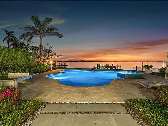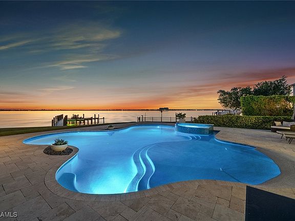 RARE! Luxury Riverfront Living on Oversized (Close To 1/2 Acre) Riverfront Lot! Welcome to your private paradise! This completely renovated modern riverfront home (Remodel was complete prior to Hurricane IAN) offers unparalleled luxury and breathtaking sweeping waterfront views appointed with white oak wood floors throughout adding an extra touch of opulence. Located in one of Cape Coral’s most desirable areas, this home blends contemporary elegance with resort-style outdoor living. Step inside to discover a sleek, modern interior with high-end finishes, open-concept living spaces, and expansive hurricane impact windows showcasing the stunning riverfront as soon as you step through the front door. Step outside, and experience the Florida paradise lifestyle living you deserve with an extended lanai, built-in outdoor kitchen, and built in custom fire pit area. Soak in the sun in your zero entry resort-style pool and hot tub. As you bask in the sun you’re surrounded by a professionally designed landscape and enhanced outdoor speakers for seamless entertainment. The buried 500 gallon propane tank fuels the whole house generator, pool heater, fire pit, and grill for effortless convenience. For boating enthusiasts, the oversized boat dock built for two lifts can accommodate your boats and jet skis, providing direct access to the open waters. Security is top-notch with 4K high-definition exterior cameras ensuring peace of mind. This is more than a home—it’s a waterfront retreat, offering modern sophistication, state-of-the-art features, and a prime location. Don't miss this opportunity to own a piece of paradise in Cape Coral. With the best location for easy access to Cape Coral and Fort Myer’s best dining, shopping, medical, and more. Schedule your private showing today! Note these photo's were taken at sunrise they are real and not enhanced. Completely Renovated | Resort-Style Pool | Outdoor Entertainment Spaces | Oversized Dock.