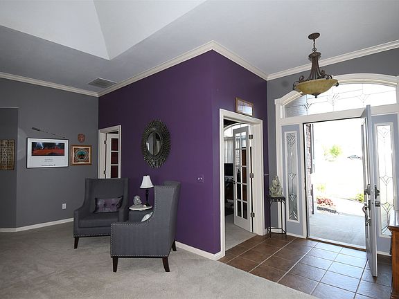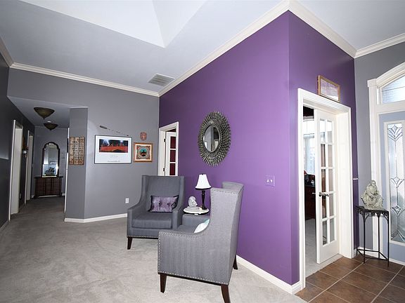 Pending taking back up offers. Live in lovely Sorrento in this custom Delegrange split bedroom ranch that backs to a large open field. Quoin brick corners with covered entrance and inviting front entry. Metal fenced yard. The striking front door takes you to the marble foyer that leads to the Great room with crown molding and corner Shiplap fireplace. Conveniently enter the den from either set of glass pane french doors. Freshly painted kitchen with farm sink, laminate wood floors, quartz counters, breakfast bar and all appliances remain. Large dining room looks out over the private yard. You will appreciate the over sized master en suite with unique ceiling lines and walk in closet. Washer and dryer remain and has closet for hanging clothes.