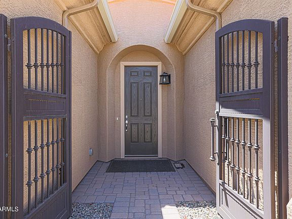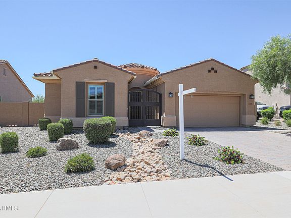 Gorgeous 3-bedroom 2 1/2 bath + Den, 3 car garage gently lived in Crimson plan located in the highly desired Windrose at Zanjero Trails community. Rare oversized lot with no neighbors behind and stunning unobstructed mountain views. Beautiful low maint. landscaping with pavers, artificial turf and room for an RV gate. Great room split bedroom floor plan, 10 ft ceilings, 8 ft interior doors, plantation shutters, wood look tile throughout, carpet in the bedrooms, walk in closets in every bedroom, upgraded kitchen with espresso cabinets, granite countertops, stainless steel appliances, gas cooktop, wall oven & built-in microwave. Options include bay window at Owner's Suite, extended covered patio, powder room, garage service door, paver driveway and an amazing walk-in shower in the Owner's Bath