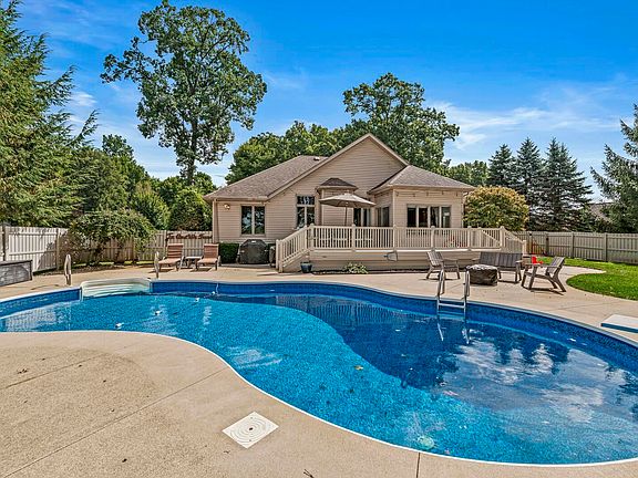 This beautiful, split floor plan ranch home includes a hard wired, full home generator. Carpet and vinyl plank is newer throughout the main level. The large eat-in kitchen walks out to the vinyl deck and pool area. Enjoy the gas log fireplace and arched entryway in the main level great room. Primary suite includes separate walk-in shower, large soaker tub and walk-in closet. 2 additional guest rooms and guest bath on main as well. The basement is finished with a spacious rec room, playroom and room for a 4th bedroom. Plenty of storage available in the basement. Yard is professionally landscaped and irrigated and back yard boasts a maintenance free vinyl privacy fence and heated, heated inground pool w/ 1 year old liner.