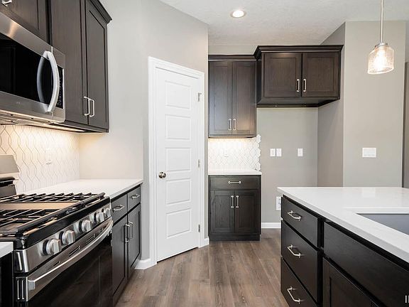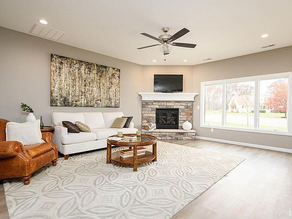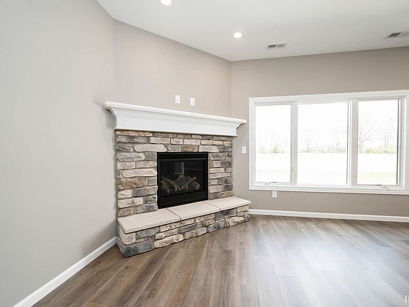 Beautiful new split bedroom ranch home for sale by Granite Ridge Builders. This open concept plan is located in Northwest Allen County schools. The great room features a corner fireplace with stone surround and a large picture window overlooking the backyard. Spacious custom kitchen has custom stained cabinetry, quartz countertops, a large island, breakfast bar, stainless steel gas range, dishwasher and microwave, plus a corner pantry. A flex room is located off the kitchen and nook which could serve as a den or an extra seating area. A sliding glass door leads from the nook to an outdoor patio. The owner's suite is spacious with a large walk-in closet and full bathroom complete with a double sink vanity and shower.