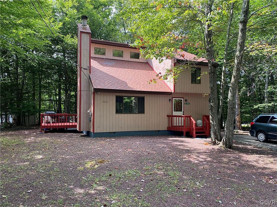 This Pocono Country Place Contemporary Salt Box home is sure to check all of the boxes for the vacation home/short term rental that you have been searching for or make it your full time residence. Brand new roof with a 50 yr warranty! Both the interior and exterior of the home have just been completely professionally painted! Entering the home you'll experience a real Pocono Salt Box/Chalet feel, open concept with a wood burning brick fireplace in the living room. Great kitchen and eating area with two decks conveniently located for outside entertaining. A primary bedroom and bath complete the first floor. Upstairs is a loft/family room area with two nice sized bedrooms and a full bath as well. Make this home your for the upcoming ski season to enjoy along with the additional short term rental income which makes this property a must have. Make your appointment today! New photos empty attach. 3 Club Houses, 2 Lakes, 6 Basketball Courts, 6 Tennis Courts, 6 Playgrounds, 4 Pools and more.