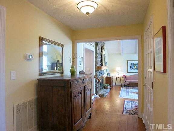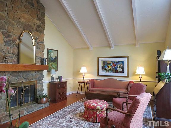 Secluded, spacious & UPDATED 4BR/2BA/2683sf ranch w/attached 2-car Garage on heavily wooded 2.28 acres in Sendero, a quiet nhood of 17 homes, adjacent to Umstead Park! Fabulous NW Raleigh location off Glenwood Ave near I-540, RTP, RDU Airport & Brier Creek shops/dining, yet in the country! Covd front Porch; gorgeous gardens, huge SunRm, big Deck w/built-in benches, 2nd Deck w/hot tub & lg paver Patio w/fire pit overlook the beautifully landscaped & heavily wooded backyard. Lg Storage Rm on back of home, plus another bigger Storage Rm in Garage. 3 yr-old HVAC; hardwood flrs throughout home; welcoming Foyer w/random width pine flrs & coat closet; big sunken Living Rm w/floor-to-ceiling stone FP, random width pine flrs, vaulted & beamed ceiling, shiplap wainscot, chair rail & huge windows; lg vaulted Family Rm w/2nd gas log FP flanked by built-in cabinetry, Brazilian cherry flr, CF, recessed lights, ceiling speakers & French drs to Deck, open to Dining area w/door to SunRm & big, fabulous Kitchen w/lots of 42 white cabinets (soft close; several floor-to-ceil), glass tile backsplash, white appls (wall convection oven, MW, DW), Brazilian cherry flr, huge granite-topped eat-at island w/5-burner gas cooktop, pantry closet, solid surface ctrs w/integrated dbl sink, recessed & track lights; spacious Laundry/Mud Rm w/tile flr, tons of storage, WI pantry area & access to Garage; Master Bedroom w/Brazilian cherry flr, CF, 2 lg fitted WICs & gorgeous Bath w/long granite-topped vanity w/dbl sinks & storage tower, huge tiled steam shower w/2 shower heads & teak bench; MBR accesses huge SunRm w/vaulted bead board ceiling, 2 CFs, pine flr, gas heater & door to Deck w/hot tub; 3 add'l spacious Bedrooms w/hrdwd flr, CF & lg closets share Hall Bath w/tiled flr & tub/shower.