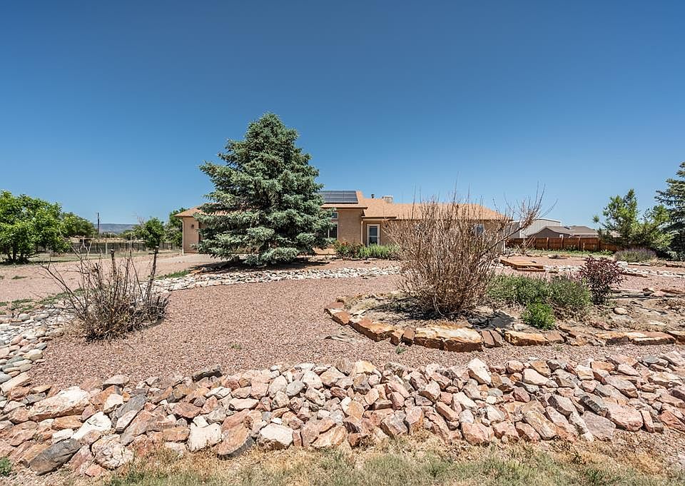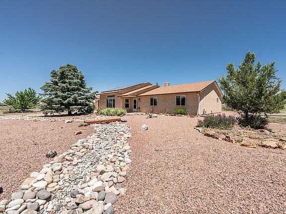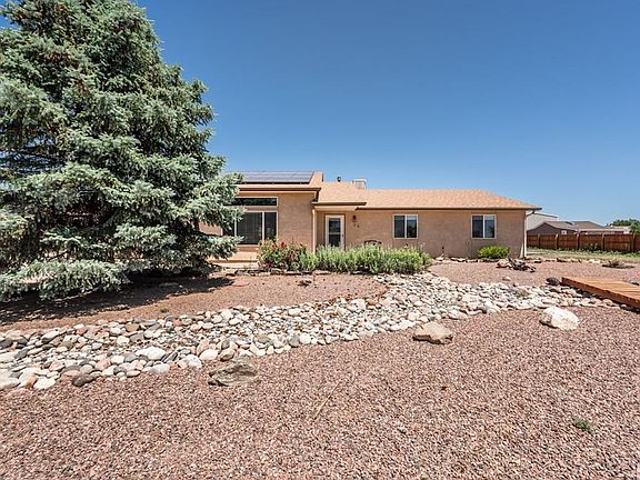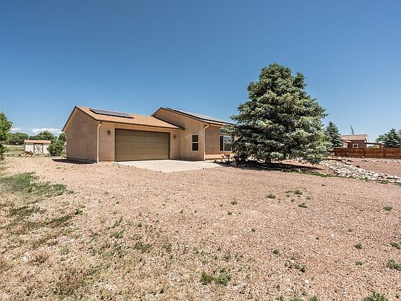 Exceptional Penrose rancher offers low exterior and landscape maintenance! This updated one owner home offers a very inviting, open great room with 10ft. ceilings that encompasses the dining & kitchen - Perfect for entertaining lots of family & friends. Gorgeous laminate flooring throughout. Kitchen boasts lots of oak cabinetry with quartz counter tops. Kitchen island seats four. Full stainless steel appliance pkg. to include; Refrigerator, dishwasher, electric range/oven, built-in microwave. Large laundry room is conveniently located off of the kitchen and also serves as the pantry. Washer & dryer are included. Spacious Primary suite measures 18' x 18' and includes brand new carpet, walk-in closet, 3/4 bath with tiled walk-in shower. Bedrooms 2 & 3 are very spacious as well and also offer brand new carpet with ample closet space. Full guest bath with tiled tub surround also serves the additional bedrooms. For energy savings, the sellers have had roof-mounted solar added by Solarise - Advantage Solar, LLC. in 2020. A certificate of completion provided by the Fremont County Building Department. Covered front porch with stamped concrete, Oversized two car garage, covered patio with alluring views measures 28'x 14'. Constructed with wheelchair friendly doorways, hallway, light switches. Two Sheds in back yard. RV parking with 50 amp plug, Raised flower beds. Centrally located with a short drive to Ft. Carson/Colorado Springs, Canon City, Pueblo, Florence.