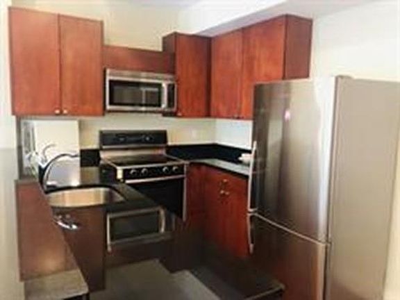 Corner unit in an elevator building. Modern kitchen with stainless steel appliances, cherry cabinets and hardwood floor throughout. Washer and dryer in the unit, central air conditioning. 1 car off street parking. Located near the bus to Kenmore Square, Harvard Square, Express bus to Financial district. Close to the green line and the Mass Pike.
