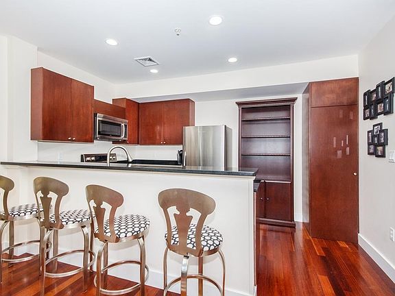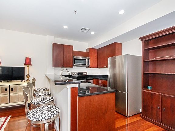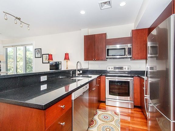 Pristine one bedroom, one bathroom condo in an elevator building with garage parking in the heart of Allston's Union Square. Built in 2007and recently updated, this beautiful corner unit gleams with abundant natural light from oversized windows. The large open floor plan is perfect for entertaining. The kitchen features cherry cabinetry with abundant storage, high end stainless steel appliances and granite countertops, and is complete with bar seating for four. Gorgeous cherry floors flow from the welcoming foyer through the kitchen and living area.The bedroom is well proportioned with a generously sized closet and wall to wall carpeting. The updated bath features a marble tiling and a glass enclosed tub. Extremely rare, full garage parking space is deeded to the unit. This home also has central a/c and a washer/dryer hook up.