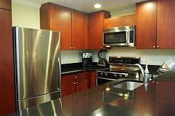 Gorgeous black granite counters with under-mount sinks Fisher Paykel and Bosch appliances Stylish solid cherry cabinets, cherry wood floors, large floor to ceiling windows and 2 well sized carpeted bedrooms including a master with private bathroom and walk in closet are just a few of the features. Travertine tiled bathrooms (hall bathroom has tiled shower stall). 2 car GARAGE parking. In-unit laundry. Fully applianced.