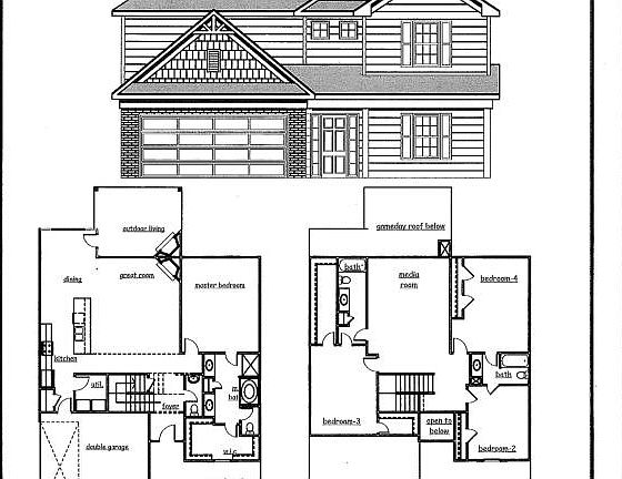 The ''Aspen Plan'' new floor plan with master on main level...open concept with kitchen and dining area opening into family room with corner fireplace. Stainless Steel Appliances. 2nd floor has 3 bedrooms each with access to baths.. and a center media/bonus room. Walk in storage room. Kitchen counter top and bath vanity tops are granite. Tile in the baths. Large covered ''Game Day'' patio area with fireplace and wired for TV.