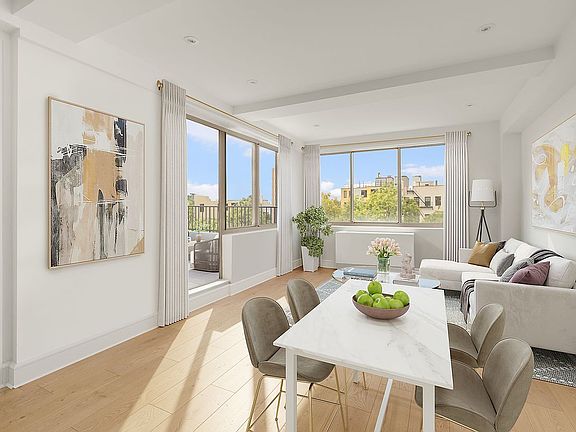 The expansive living and dining area is bathed in natural light from six oversized south and east facing windows, and opens directly onto the terrace. The bedroom accommodates a queen bed and features a deep closet, while every room benefits from year-round warmth and light across multiple exposures.