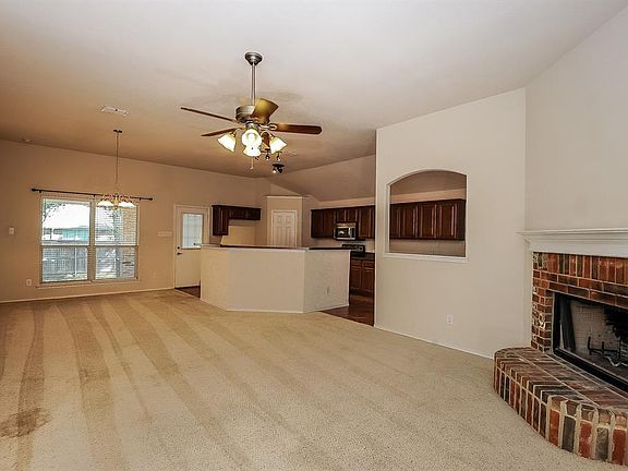 This Azle one-story home offers a wood-burning fireplace, kitchen stainless steel appliances, master bathroom separate tub and shower with dual sinks, covered patio, and a two-car garage.