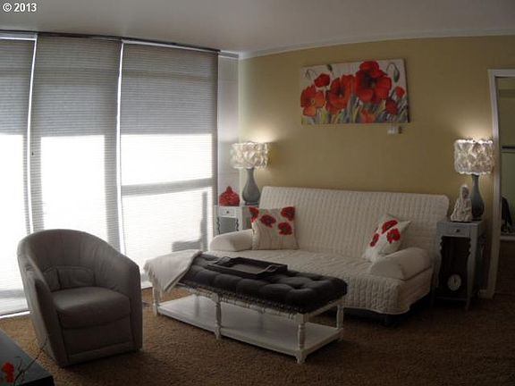 Modern lvng in a secure bldg, 2 bdrm, grt flr plan, flr to ceiling windows, light & bright. Awesome kitn/din rm, tile flr, maple cab, gas appl, W & D includ. Outdr din on balcony w/view. Mstr bdrm w/ walk-in cls. Newer crpt, paint, light fxtr & Honeycomb blinds. Prfct lctn: mnts to Lllyd Cntr Mall, Theatres, Rose Garden, Downtown, restaurants, steps to max/strtcar & much more. Cmn area on 2nd flr grt for barbecue & entertainment!