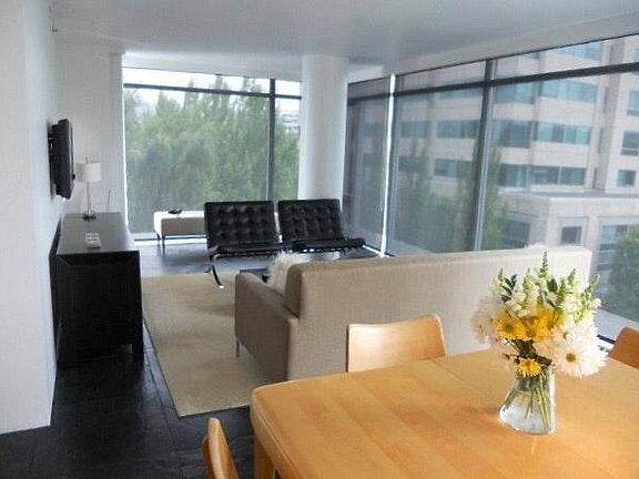 Beautifully furnished 2 bedroom (second bedroom set up as den with sleeper) 1 bath new condo overlooking city lights and to the West and tree tops/St Helen's to the East. This east side unit is ON the Max line for easy access to all of Portland and the airport. This corner unit features floor to ceiling glass, washer/dryer, heated slate floors, secure garage parking and a cozy bistro on the ground floor. Price includes cable HD TV w/DVR, telephone, high speed internet, A/C, heat (all utilities), and monthly housekeeping. Call 503-793-0751 or respond to this ad.
