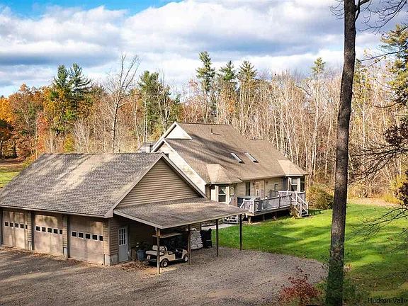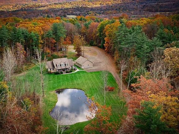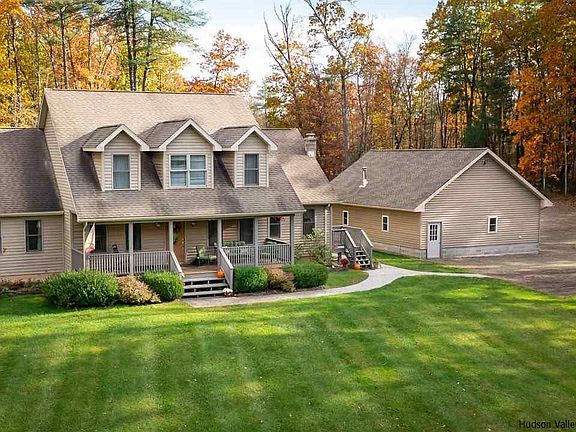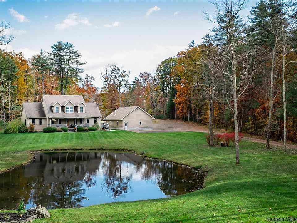 Here's an immaculate cape with a contemporary twist that's located on a quiet country road in happening Accord. Sited privately and well off the road with a covered front porch overlooking a lovely pond, the house offers loads of space - three generously sized bedrooms, including a first-floor primary suite, two full and two half baths, a home office, finished basement and an unfinished walk-in attic that could be converted to many uses. There are vaulted ceilings with skylights as well as a pellet stove in the living room, and French doors that open to the rear deck and hot tub. The kitchen is huge and features an island/breakfast bar, wood cabinets and a large pantry. There are multiple outbuildings on the property, including a heated three-bay garage, a one-car garage and an adorable studio with board and batten siding. Local destinations include Westwind Orchard, Arrowwood Brewery, the new Inness Hotel + Restaurant, Accord Market, Minnewaska State Park, Mohonk Preserve and nearby Kingston, Woodstock and New Paltz.