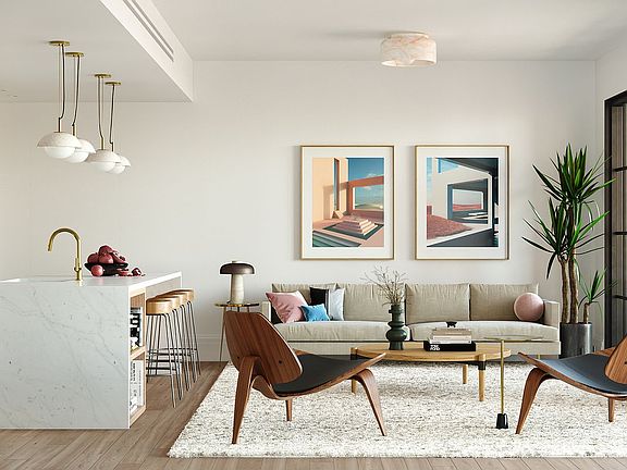 Residence 5A is an ideally laid-out 3-bedroom, 2.5 bathroom home with a spectacular South-facing 33'' wide living/dining space with a large balcony overlooking the landscaped courtyard. The open kitchen features a walk-in pantry, 48" Bluestar range, and an extra-wide island with breakfast bar. The primary bedroom has 3 closets and a large, windowed ensuite bath with double vanity.