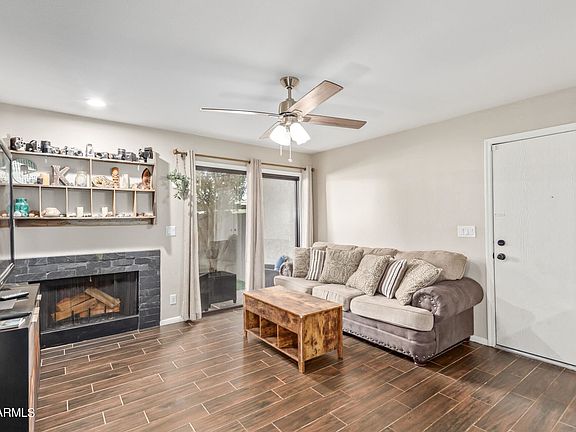 Check out this beautiful 2beds, 2 baths end unit apartment in Mesa with a NEW 2020 Trane AC System! Cozy interior features wood-look tile floors, soothing palette, and a bright living room w/a fireplace and sliding glass window to the patio. Wood accent wall in the dining room! Modern kitchen boasting ample cabinets, granite counters, and a breakfast bar. Carpeted main bedroom enjoys a private ensuite and a walk-in closet. Patio has tree giving you extra privacy and shade with synthetic grass. Community provides a resort-like pool and spa amenity. What are you waiting for Take a tour today!