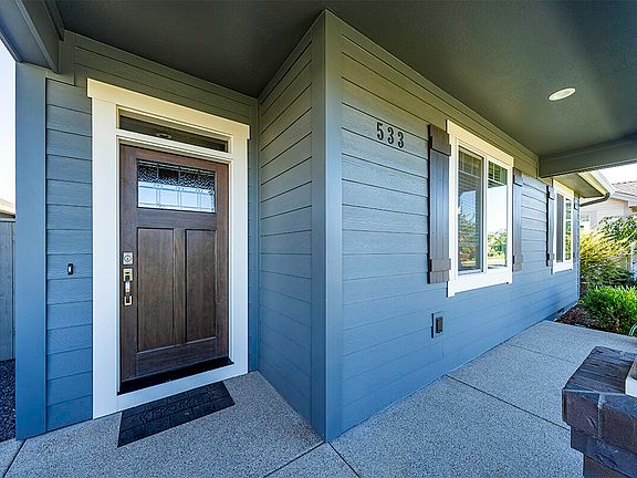 Wonderful Summerfield cottage with a large front porch and territorial views. This cottage offers a courtyard patio, and a separate pavered patio for great outdoor living spaces. White painted cabinets in the kitchen with white quartz counters and a large kitchen window. Grey stained, wide plank hardwood floors in all main living spaces. Gas fireplace with a white stone surround. Large primary bedroom with a spacious closet. The main bath offers a large walk-in shower, dual vanity and great natural light. Open floor plan with split bedrooms. There are no steps from the garage into the home. Earth Advantage Platinum certified for energy efficiency. Close to the Summerfield Neighborhood Park. The refrigerator and small shed are included.