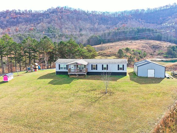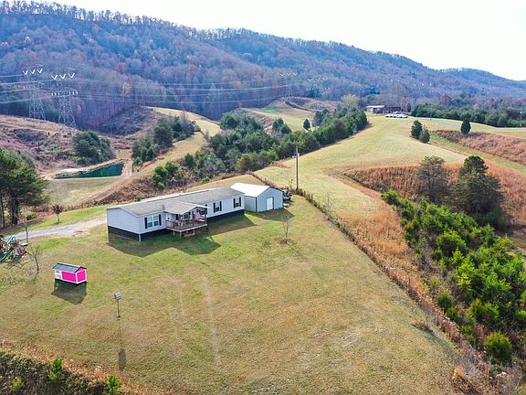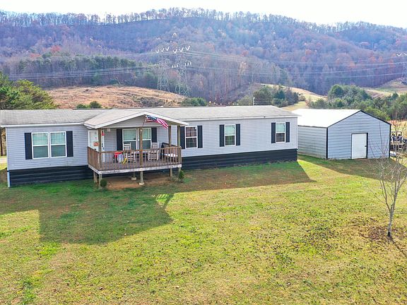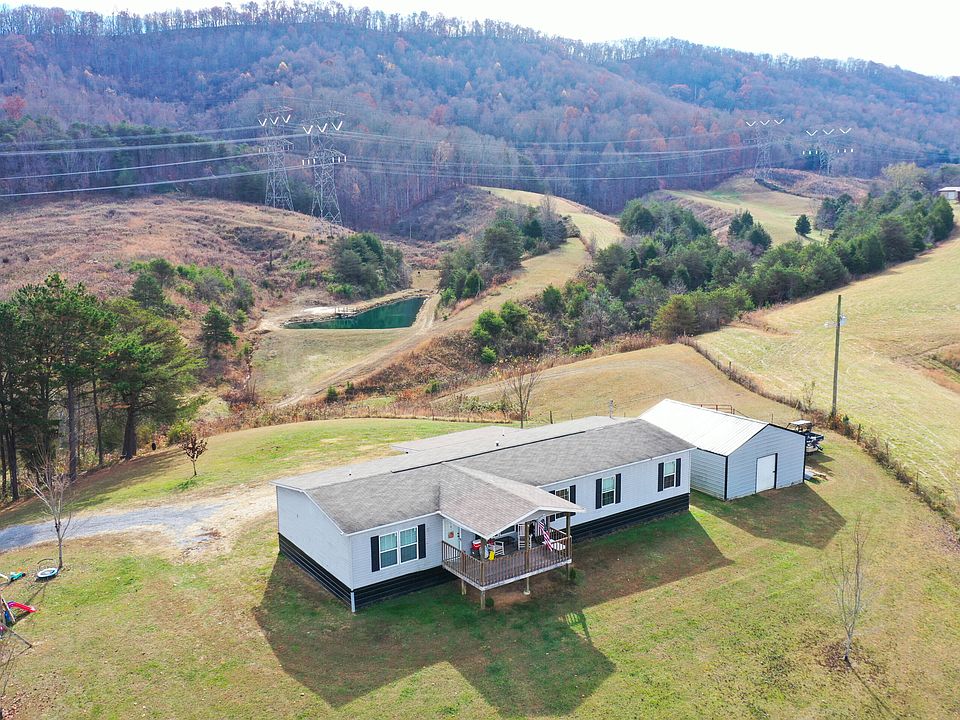 Discover the tranquility of this beautiful 4-bedroom( septic permit indicates 2 bedroom), 2-full bath manufactured home on 7.51 acres of pristine countryside. Enjoy breathtaking mountain views, custom shiplap details in the living room and kitchen, and the serenity of a large spring-fed pond. This home, featuring a split bedroom design, offers privacy, comfort, and the perfect blend of indoor and outdoor living. This charming home invites you into an open concept space from the kitchen to the living room, adorned with custom shiplap for a touch of rustic elegance. The split bedroom design ensures privacy, with all rooms boasting walk-in closets for added convenience. The large master bath features both a soaking tub and a shower, providing a luxurious retreat within your own home. An additional large den or second living room offers flexibility for various lifestyle needs. Both the front and back porches are covered, providing the perfect spots to enjoy the incredible mountain views and the peaceful surroundings. Outdoors, a large detached garage provides ample storage space. The property is fenced and perfect for animals or a mini farm, with a large spring-fed pond adding to the natural beauty of the landscape.
