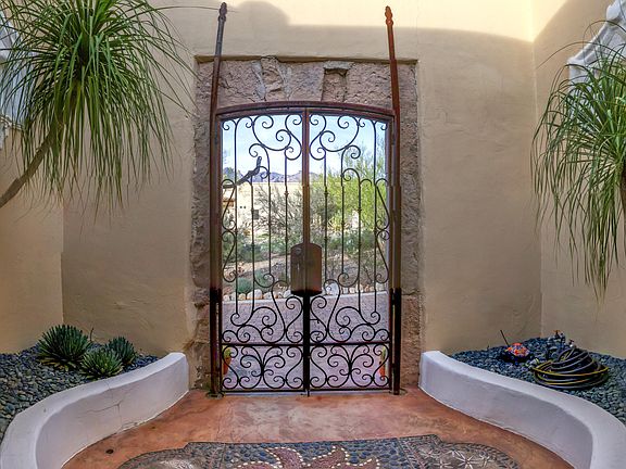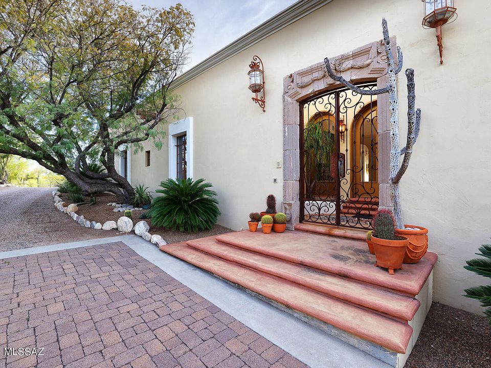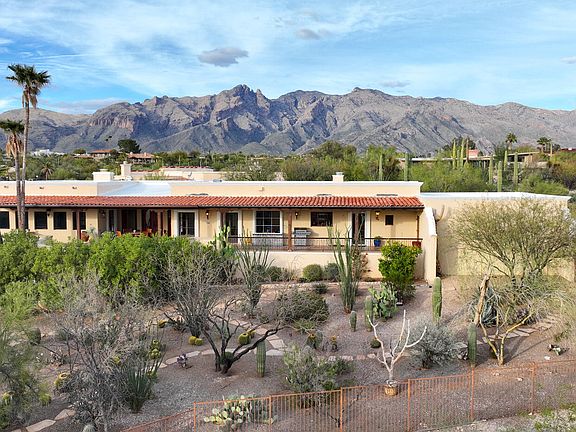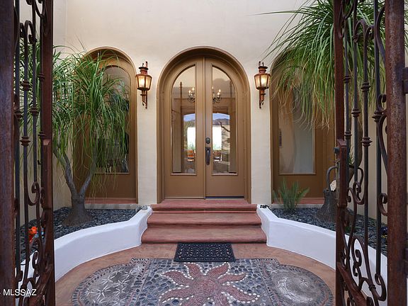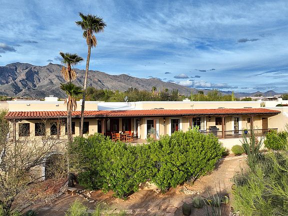 This beautiful Spanish Colonial sits on 1.37 acres with mountain, sunset, and city views perfect for the premier buyer. The property is rich in historic elements from Mexico and Tucson's Old El Conquistador Hotel, which along with its architectural character, reflects the class and charm of the Old Foothills. As you enter through the front courtyard, stately doors with large arched windows you will be drawn to the spacious back patio perfect for entertaining, coffee, and star gazing. The entry level includes master suite with fireplace, sitting area, two walk-in closets, and private courtyard; junior suite; 2 1/2 baths; formal living and dining; library/den; kitchen with dining area; and laundry room. A covered patio with Spanish tile roof runs the length of the home and overlooks the fenced, landscaped back yard. An exterior stairway at the west end of the patio leads to the lower level which includes 2 BR/1BA Guest Quarters with private entry perfect for older children, guests, or vacation rental. The adjacent lounge/recreation room boasts an indoor shooting range and wine cellar secured by an old jail cell door from Lincoln County, NM (think Billy the Kid). See documents for a complete history of the home.