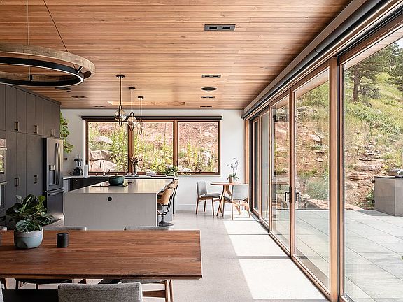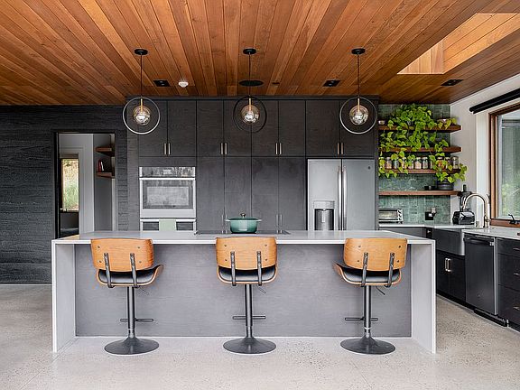 Modern open space with big windows, privacy, mountain views and 6.18 acres of surrounding nature with built-in trails. 6BR/5.5BA home plus detached garage with multi-purpose space above.