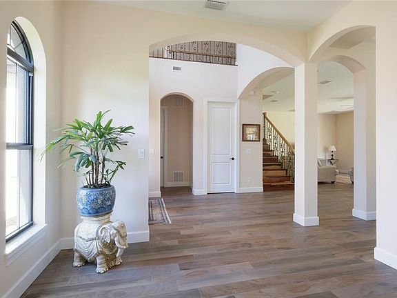 Nestled in a quiet enclave of only 10 homes, this 2015 custom built home is brimming with appeal and warm livability. No expense was spared as this home is full of high end finishes and architectural details. A pavered circular drive, and lush landscaping welcome you to the double wood door entry that leads to a spacious open floor plan for easy living and gracious entertaining. Well appointed, the home includes warm Italian porcelain tile floors on the first level, soaring ceilings, and arched doorways to name just a few. The gorgeous chef's kitchen features dovetailed wood cabinets, level 5 Cortessa granite countertops, Thermador stainless steel professional gas appliances, gorgeous designer backsplash, and breakfast nook. All overlooking the spacious living space with pocket sliders that open to the covered lanai and private back yard with wooded view. The expansive master retreat features pocket sliders to the covered lanai, two walk-in closets, and a gorgeous en-suite bath with dual sinks, soaker tub, and walk-in Roman shower. The wooden staircase leads to 3 additional bedrooms, 2 baths, and a bonus room. Upstairs features beautiful Brazilian wood flooring, bright spacious rooms, and sliders leading to a shared balcony for enjoying morning coffee and year-round sunshine. Other features of this home include a climate controlled 3 car garage, two Elite Lennox AC units, tankless water heater, large utility room, irrigation system for the lawn and more. Located close to A-rated schools, dining and I-75.